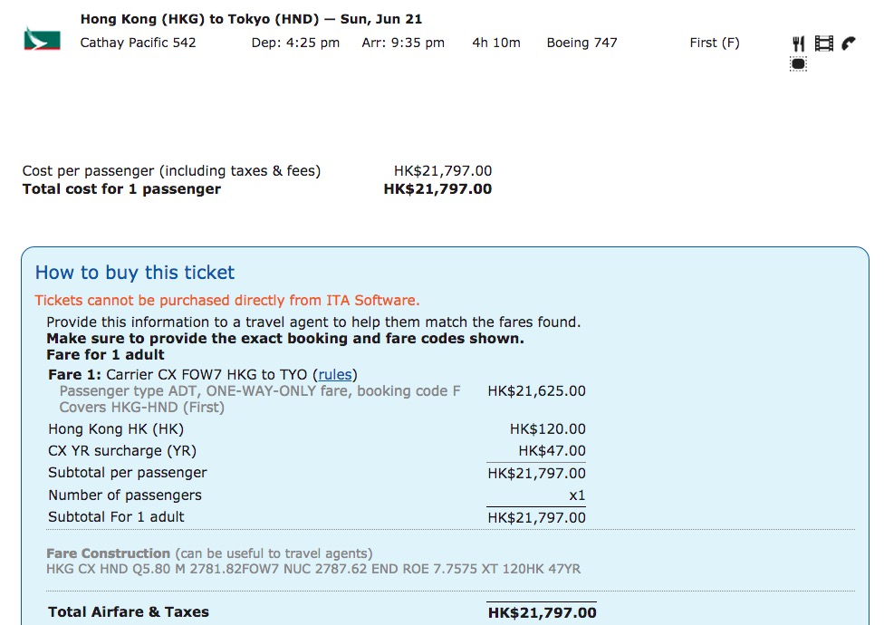 最幸運的是長工訂到了從香港直飛羽田的頭等艙班機,這張由香港直飛羽田的單程機票,票面價為21,000港幣,